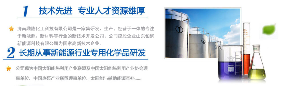 濟南鼎隆化工科技有限公司是一家集研發(fā)、生產、經營于一體的專注于新能源、新材料等行業的新技術開發(fā)公司;公司控股企業山東鉑潤新能源科技有限公司為國家高新技術企業。擁有雄厚的科研實力和專業銷售隊伍以及多名從事化學化工專業的高素質人員,其中博士生導師1人,碩士研究生3人。公司現為中國太陽能熱利用產業聯盟及中國太陽能熱利用產業協會理事單位、中國熱泵產業聯盟理事單位、山東清潔能源供暖產業聯盟理事單位、太陽能與輔助能源互補供熱/制冷工程專業委員會會員單位。公司專注于綠色科技,專業化研發(fā)環(huán)境友好型化工產品,與眾多高校和國內外多家著名化學品公司保持戰(zhàn)略合作關系。公司擁有“載能”和“澤能”...更多
